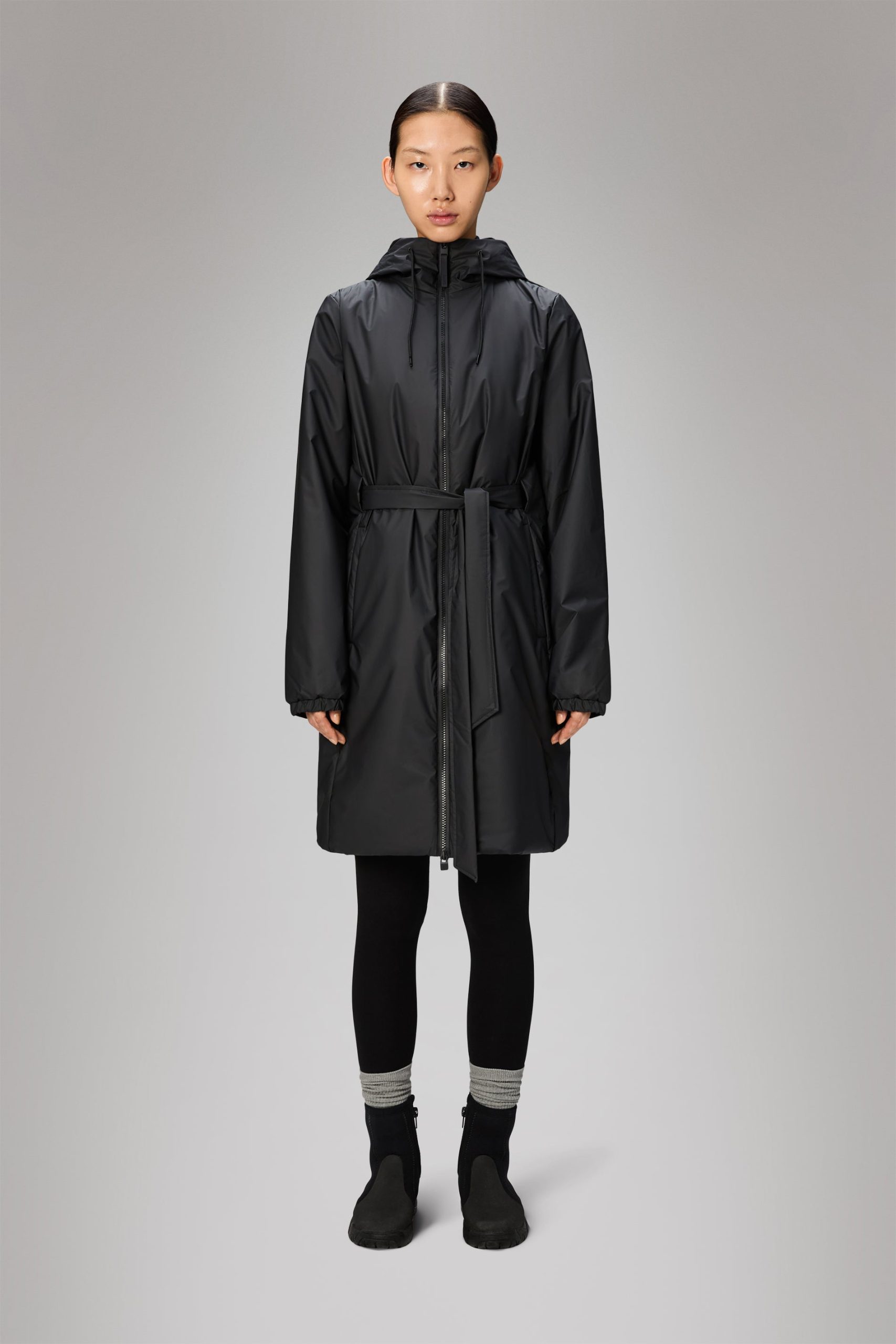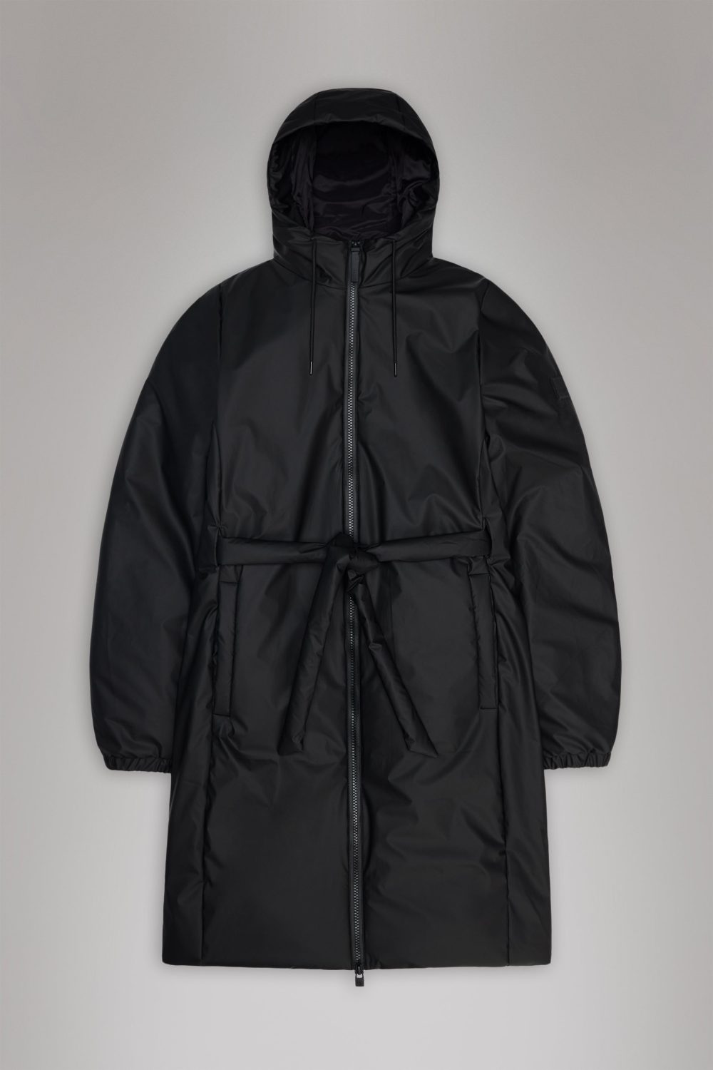 The style features concealed fleece-lined side pockets, elasticated cuffs and an insulated hood with drawstring adjustment. Completed with a belt to accentuate the waist, this long jacket is easily fitted for an individual silhouette.