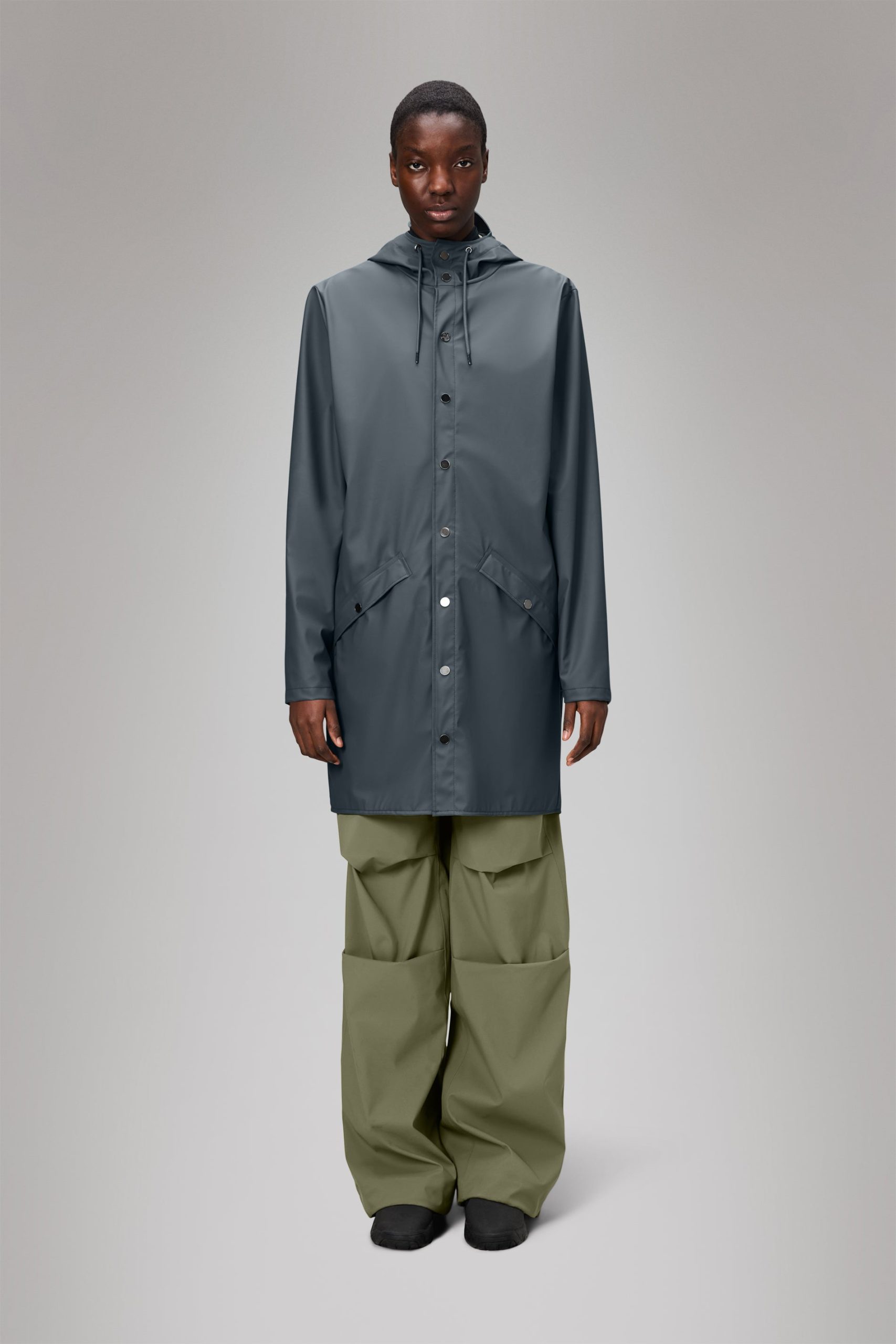 This rain jacket is a long version of Rains’ classic rain jacket. It features a placket with snap fastenings for closure, hood with built-in cap and two side pockets with snaps. Sleeves are finished with snaps making them adjustable for a loose or tight fit.